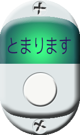 | 上のタイプで停車ランプが緑色のもの。これもどこかで見かけた覚えがあるが、確信がない。 どなたか、このボタンの存在について覚えておられる方がいらしたらBBSにてご教授いただければ幸いです。 (2003.06.29)明田車庫殿からの情報で、「とまります」のフォントを実物に近いものに修正。 (2003.07.13)しゅう@鹿児島さまの情報で、鹿児島空港尾リムジンから鹿児島交通・後に当時の林田産業交通に移った車両にて使用されていたとの情報をいただきました。しゅう@鹿児島さま、ありがとうございました。 |