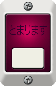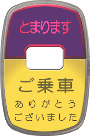 | oji040-1の横型。 まさかこれは無いだろうと思っていたら、工場長様の情報によれば、管理人の守備範囲である東急バスにて109仕様車で使用されていたとのこと。 工場長様、情報をありがとうございます。 (2003.06.29)明田車庫殿からの情報で、「とまります」のフォントを実物に近いものに修正。 (2006.05.28)T316殿からの情報で、「とまります」のフォントを更に実物に近いものに修正。 |